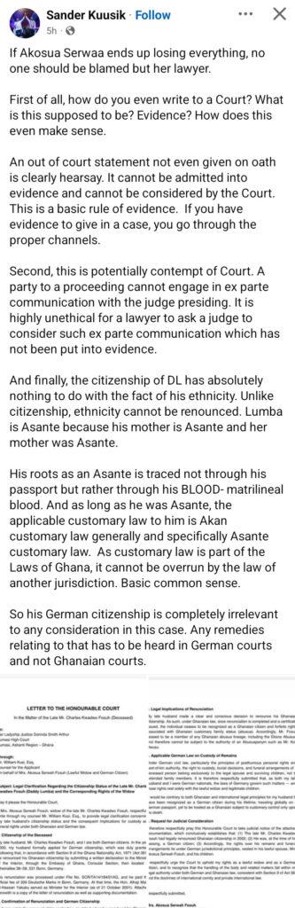 In a Facebook post, Mr. Kuusik blamed the widow’s lawyer, Mr. William Kusi, Esq., for what he described as serious professional and procedural lapses that could cost his client the entire case.