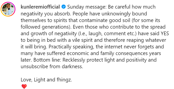 “If you come with d@rkness and neg@tivity, I will bl0ck you” – Nollywood actor, Kunle Remi sends warning note to tr0lls on his page (IMAGES)