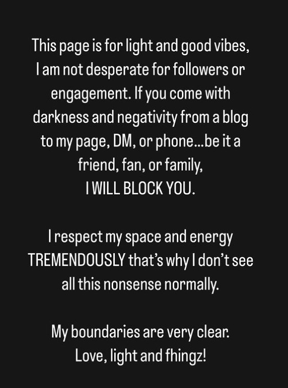 “This page is for light and good vibes, I am not desperate for followers or engagement. If you come with darkness and negativity from a blog to my page, DM, or phone…be it a friend, fan, or family.