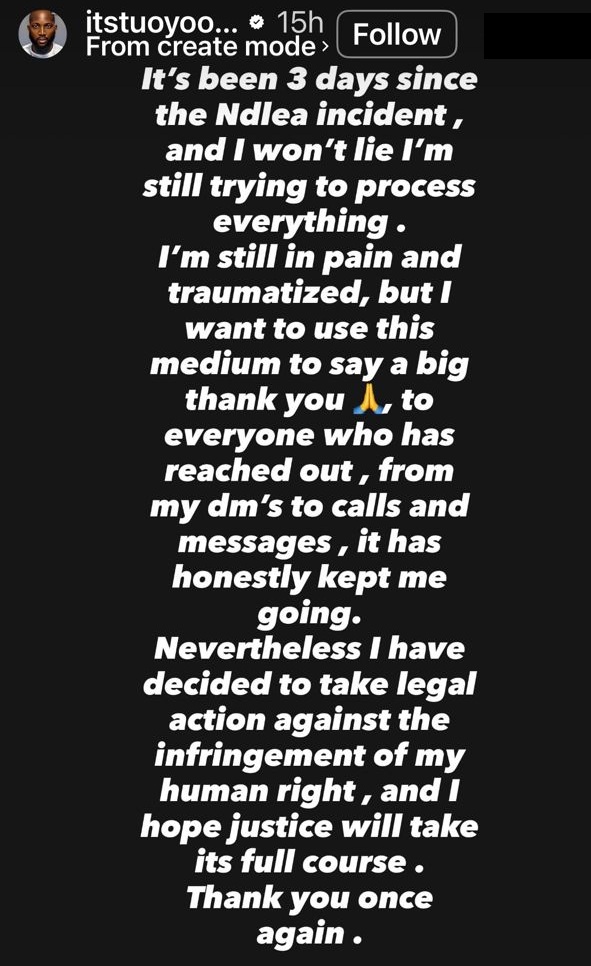 “It’s been 3 days since the NDLEA incident, and I won’t lie, I’m still trying to process everything. I’m still in pain and traumatized, but I want to use this medium to say a big thank you to everyone who has reached out, from my dm’s to calls and messages, it has honestly kept me going. Nevertheless, I have decided to take legal action against the infringement of my human rights, and I hope justice will take It’s a full course.” He wrote