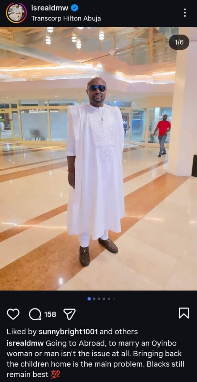 In a post shared on his Instagram page, accompanied by photos of himself at the Transcorp Hilton Abuja dressed in an all-white agbada, Israel made clear that he has no problem with interracial or international marriages in principle. His concern lies elsewhere. “Going to abroad, to marry an Oyinbo woman or man isn’t the issue at all. Bringing back the children home is the main problem. Blacks still remain best,” he wrote.