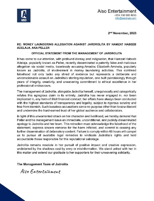 The Management of Nigerian content creator Jarvis has threatened to take legal action against fellow content creator Peller after he accused her of being involved in money laundering activities on TikTok.