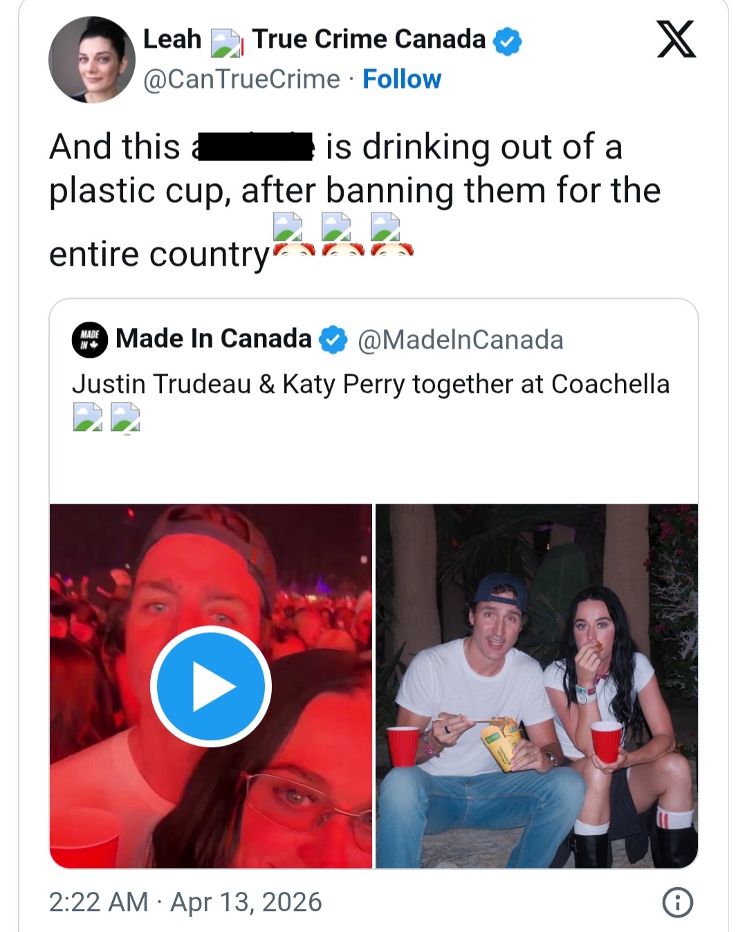 “Remember when Justin Trudeau banned plastic bags and straws for Canadians to save the planet? Now he’s posting pics using solo cups. Rules for thee, but not for me,” one person wrote on X. Another kept it shorter and sharper, calling him out directly for drinking from a plastic cup after banning them for an entire country. Someone else laid it out in a neat little timeline format: Trudeau in June 2019 announcing the plastics ban, Trudeau in April 2026 smashing drinks from a Solo cup at Coachella.