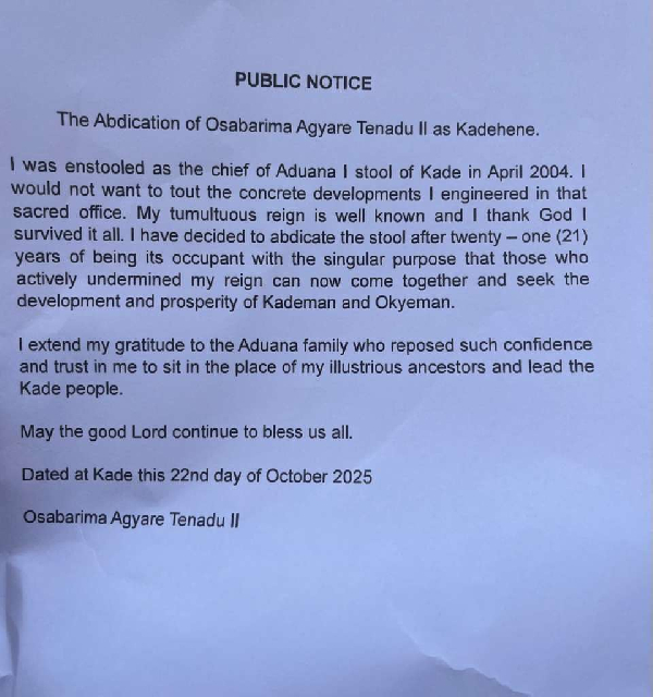 “I was enstooled as the chief of Aduana I stool of Kade in April 2004. I would not want to tout the concrete developments I engineered in that sacred office. My tumultuous reign is well known and I thank God, I survived it all. I have decided to abdicate the stool after twenty – one (21) years of being its occupant with the singular purpose that those who actively undermined my reign can now come together and seek the development and prosperity of Kademan and Okyeman”, he stated.