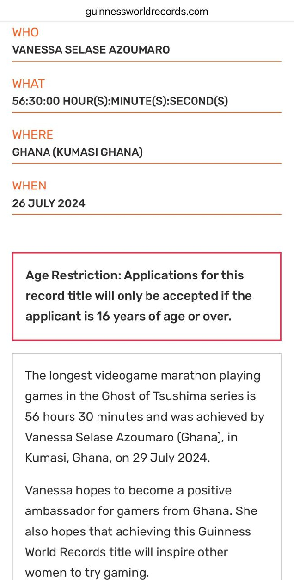 Vanessa first captured national attention when YEN.com.gh published her story on July 24, 2024, announcing her bold attempt to play video games for 48 continuous hours in pursuit of a Guinness World Record.