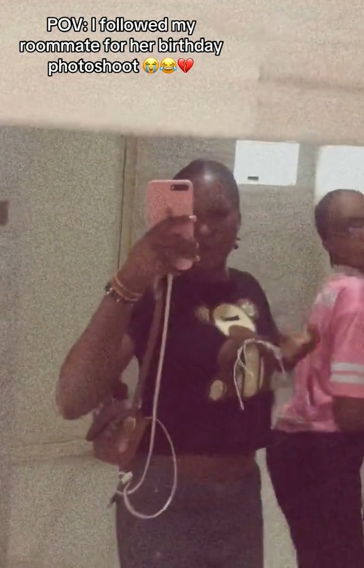 A lady has shared a hilarious behind-the-scenes clip from her roommate’s birthday shoot that has left many people amused online.