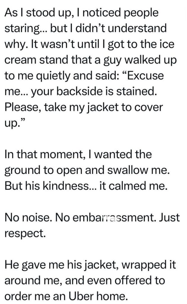 The lady could hardly contain how embarrassed she felt, but the guy’s kindness calmed her. He wrapped his jacket around her and offered to pay for her ride home.