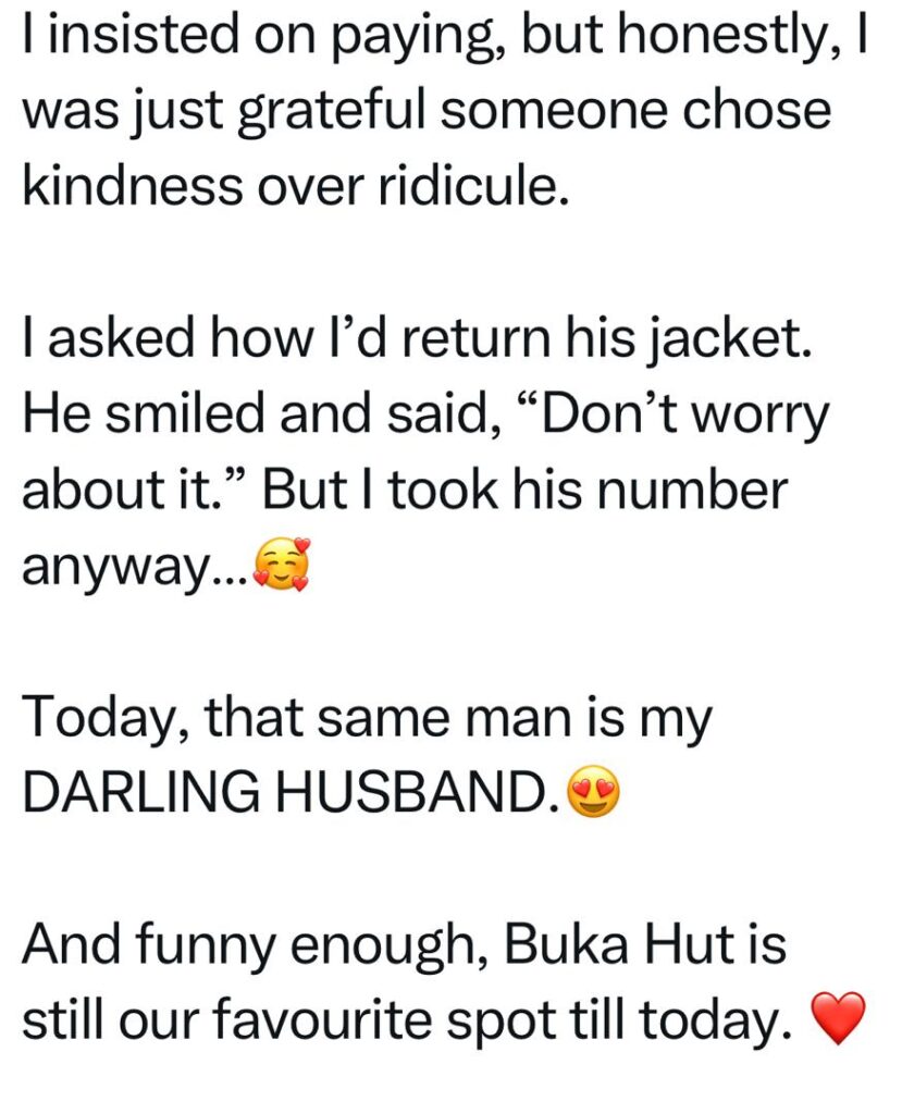 @Nedtips Now that we are in rain season, I’ll start wearing a jacket cause I might meet a girl that is cold and I’ll give her my jacket and the rest will be history. Congratulations to you both. Kindness is always a good thing.