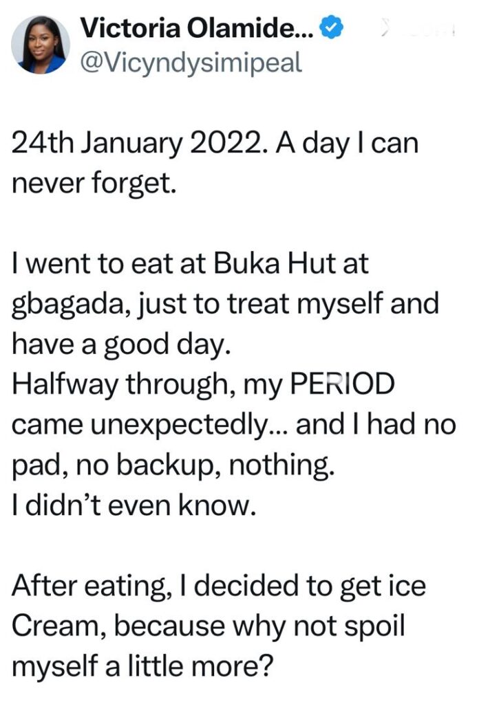 The lady had went to a Buka Hut to give herself a good time, and midway through the meal, her period came unexpectedly. She had no pad, nor any back up whatsoever.