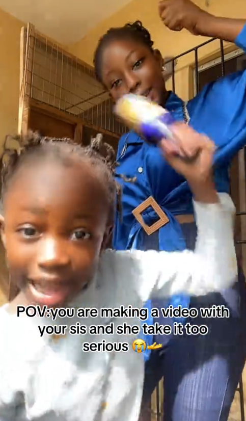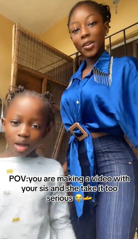 In a video shared online, the lady @promiseafolabi001 featured her sister in a trending video when she was utterly shocked by her younger sister’s seriousness.