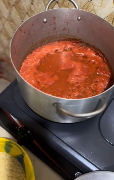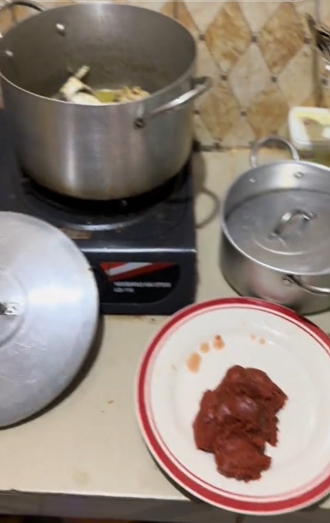 The abrupt interruption was captured as a pot of seasoned protein and another pot of pepper mix had cooked halfway through in a two-burner gas cooker.