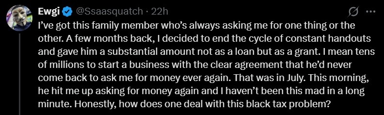 That was in July. This morning, he hit me up asking for money again, and I haven’t been this mad in a long minute. Honestly, how does one deal with this black tax problem?”
