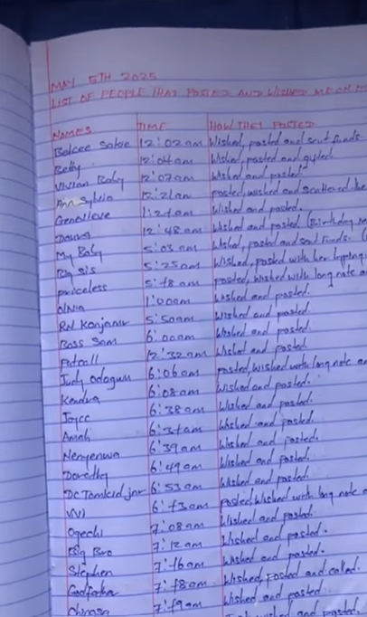 To replicate the same approach on their birthday, the lady @queenrichy6 revealed in the video that she wrote down the names of everyone who had wished her a happy birthday after her party.