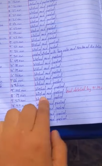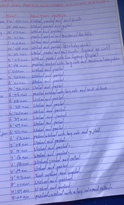 She made a list, which is seen in the video, with the names of those who sent her well wishes, their times, and posting methods.