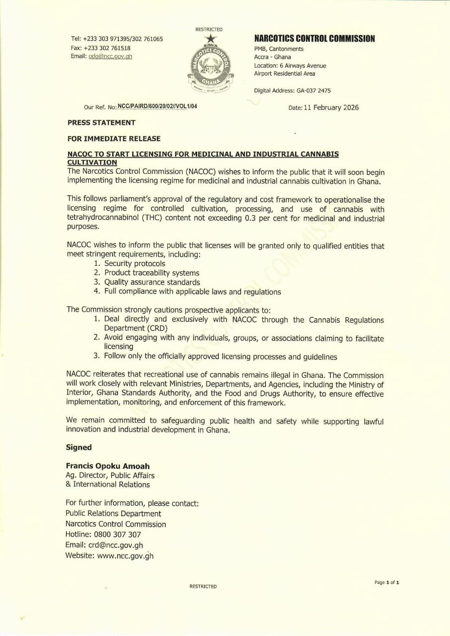 The Narcotics Control Commission (NACOC) has announced that it will soon begin issuing licences for the cultivation of cannabis strictly for medicinal and industrial purposes in Ghana.