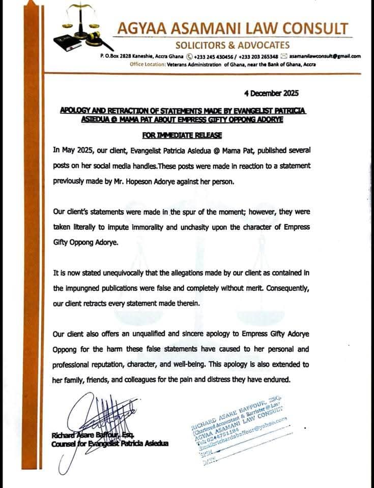 Evangelist Patricia Asiedua, popularly known as Nana Agradaa or Mama Pat, has finally issued a formal apology and retraction of all defamatory statements she previously made about celebrated gospel musician Empress Gifty Oppong Adorye.