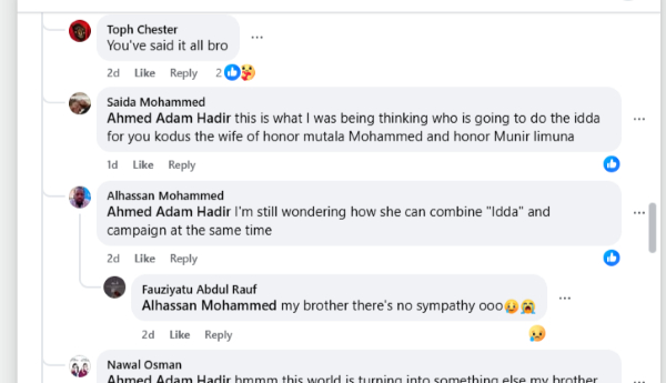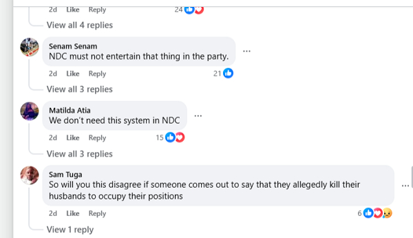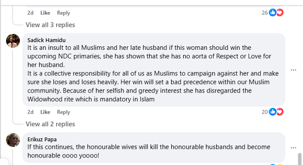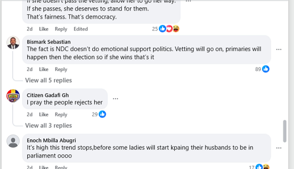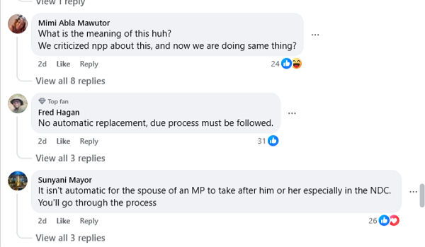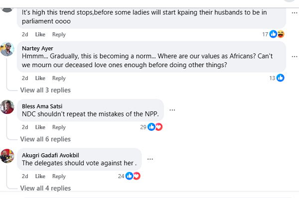 Conversely, another commenter argued, “The good people of Nima should demonstrate to this woman that the parliamentary seat is not part of her late husband’s will. What has the husband done for the area? She should step aside.”