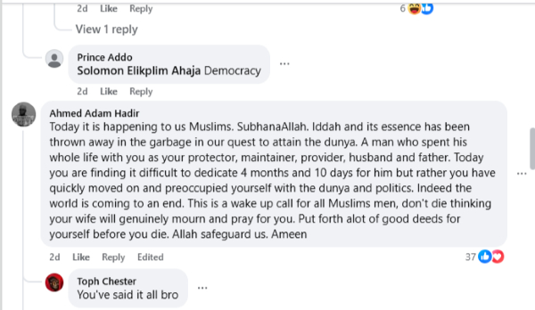 Ahmed Adam Hadir also criticised the decision from a religious perspective, stating, “Today it is happening to us Muslims. SubhanaAllah. Iddah and its essence have been ignored in the pursuit of dunya. A man who spent his whole life with you as your protector, maintainer, provider, husband, and father…