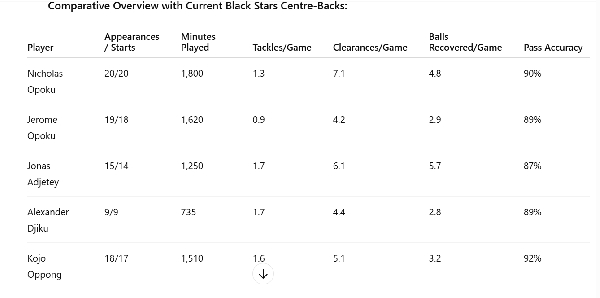 Here is the combined statistics of Nicholas Opoku, Jerome Opoku, Jonas Adjetey, Alexander Djiku and Kojo Oppong Preprah.