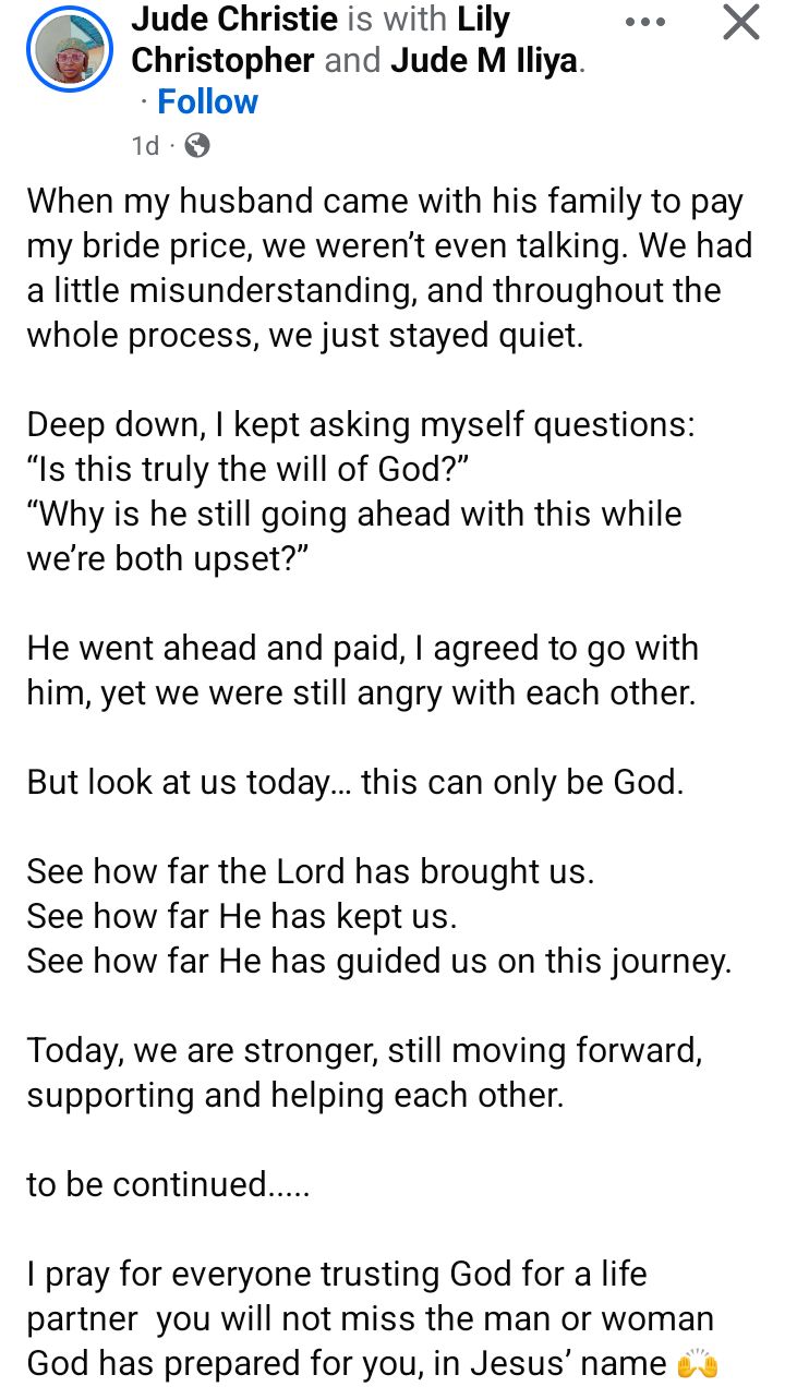In her own words: “When my husband came with his family to pay my bride price, we weren’t even talking. We had a little misunderstanding, and throughout the whole process, we just stayed quiet. Deep down, I kept asking myself questions: Is this truly the will of God? Why is he still going ahead with this while we’re both upset? He went ahead and paid, I agreed to go with him, yet we were still angry with each other. But look at us today. This can only be God.”