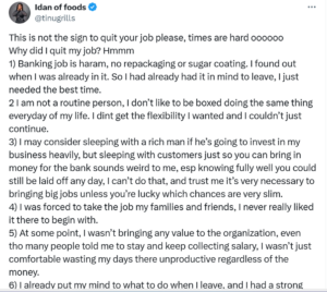 A former female Nigerian Banker has stirred up conversations online after she revealed the circumstances that had made her quit her well-paying job in the banking industry.