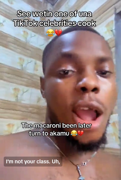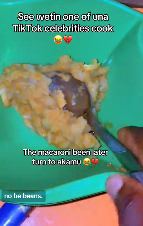 In the clip, he showcased the soggy macaroni she had prepared, similar to bean porridge; the macaroni was overcooked due to excess water.