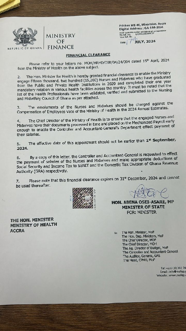 According to Dr Afriye, financial clearance for the recruitment of about 15,000 health professionals was originally secured under the erstwhile New Patriotic Party (NPP) government.