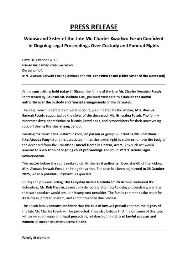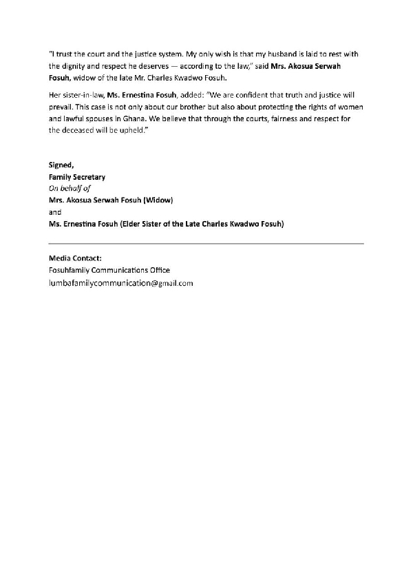 “The Fosuh family remains confident that the rule of law will prevail and that the dignity of the late Mr. Charles Fosuh will be protected. They also believe that the outcome of this case will serve as an important legal precedent, reinforcing the rights of lawful spouses and women in similar situations across Ghana,” the statement added.