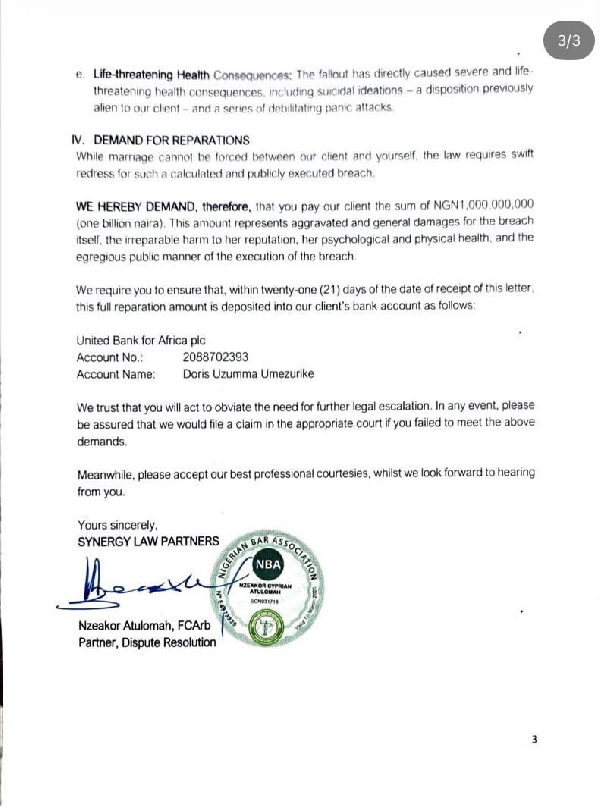 On the basis of these claims, Synergy Law Partners is demanding N1 billion in compensation and has given a 21-day deadline for payment, warning that failure to comply could lead to further legal action.