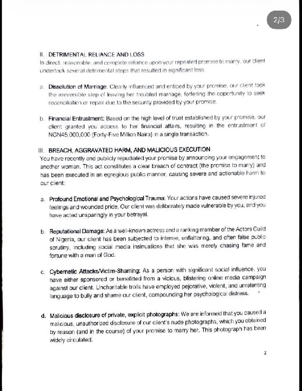 According to the legal team, Ogala’s relationship with Pastor Chris Okafor began in 2017, at a time when the actress was facing difficulties in her marriage. The letter states that Okafor initially offered pastoral guidance, during which period he allegedly made a clear commitment to marry her.