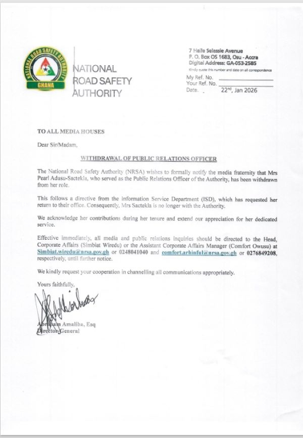 “The National Road Safety Authority (NRSA) wishes to formally notify the media fraternity that Pearl Adusu-Sateckla, who served as the Public Relations Officer of the authority, has been withdrawn from her role,” it said.