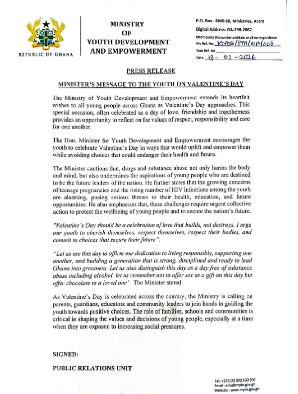 The Ministry of Youth Development and Empowerment has extended warm Valentine’s Day wishes to young people across Ghana while urging them to mark the occasion with responsibility and self-respect.