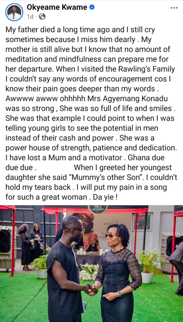Kwame described Nana Konadu as a woman whose life radiated strength and joy. “Awww awww ohhhhh Mrs. Agyemang Konadu was so strong. She was so full of life and smiles. She was that example I could point to when I was telling young girls to see the potential in men instead of their cash and power. She was a powerhouse of strength, patience, and dedication,” he said.
