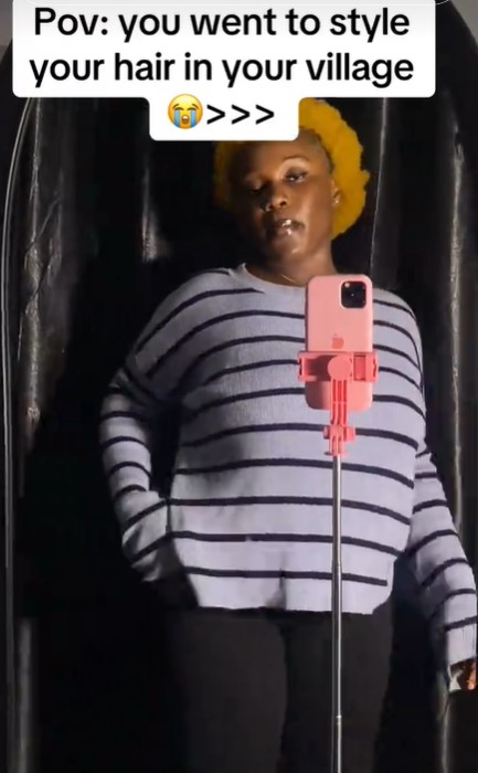 In the caption, the lady disclosed patronizing a hairstylist in her village to style her hair from Afro-tinted hair into curly twists.