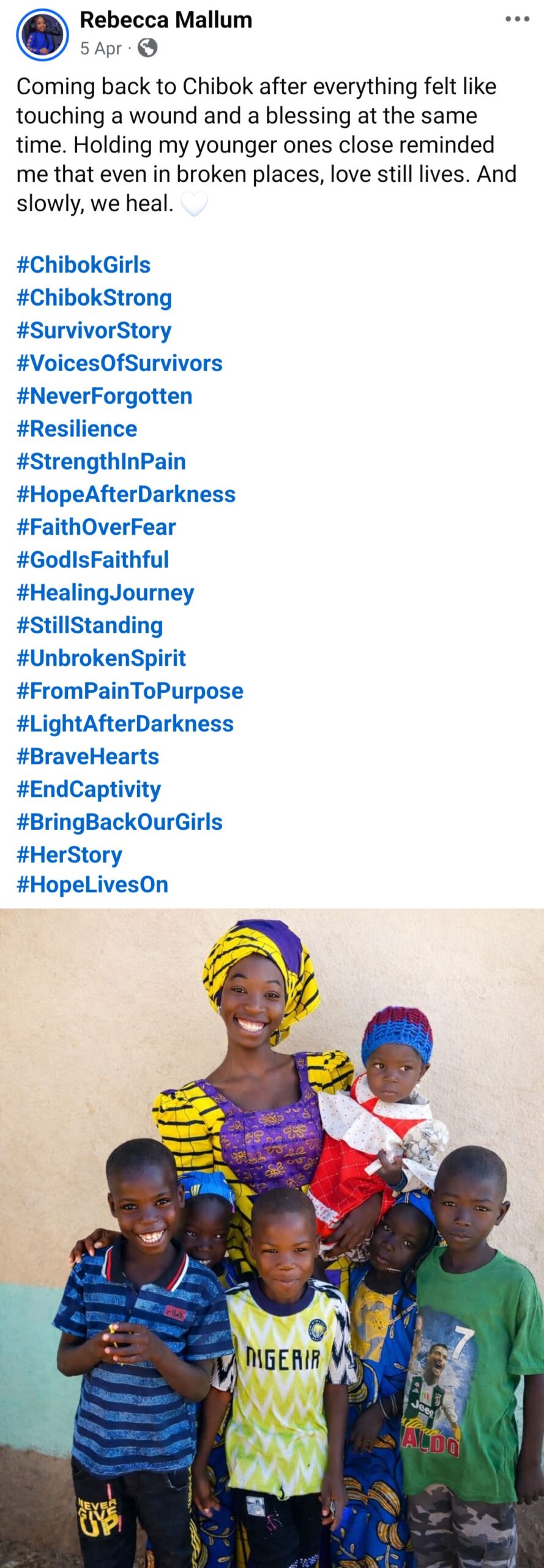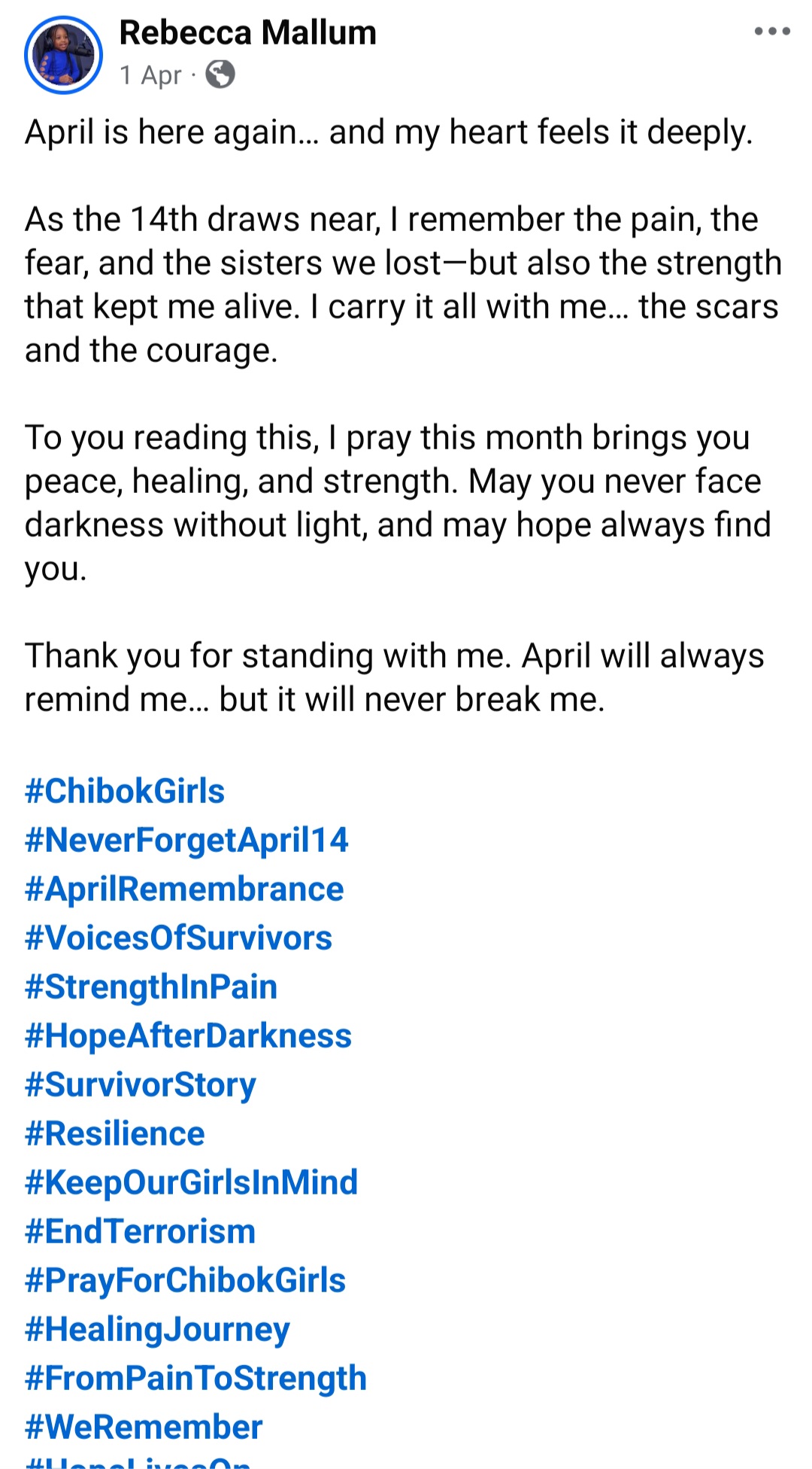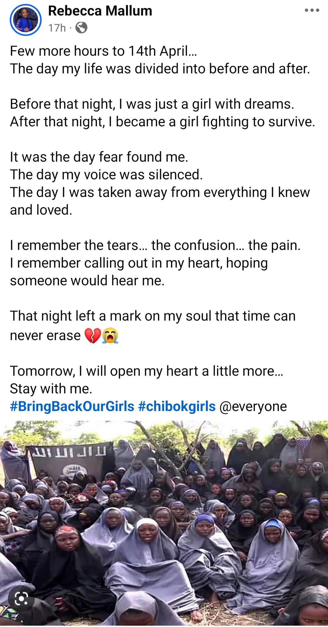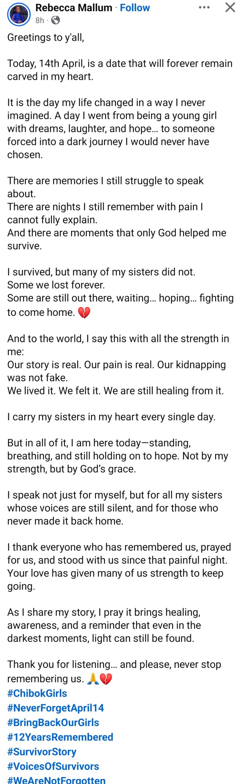 Rebecca ended her post with gratitude for those who have continued to remember, pray and stand with the girls over the years, and with a plea that the world never stop doing so. She said she speaks not just for herself but for the sisters whose voices are still silent, and for those who never made it home at all.