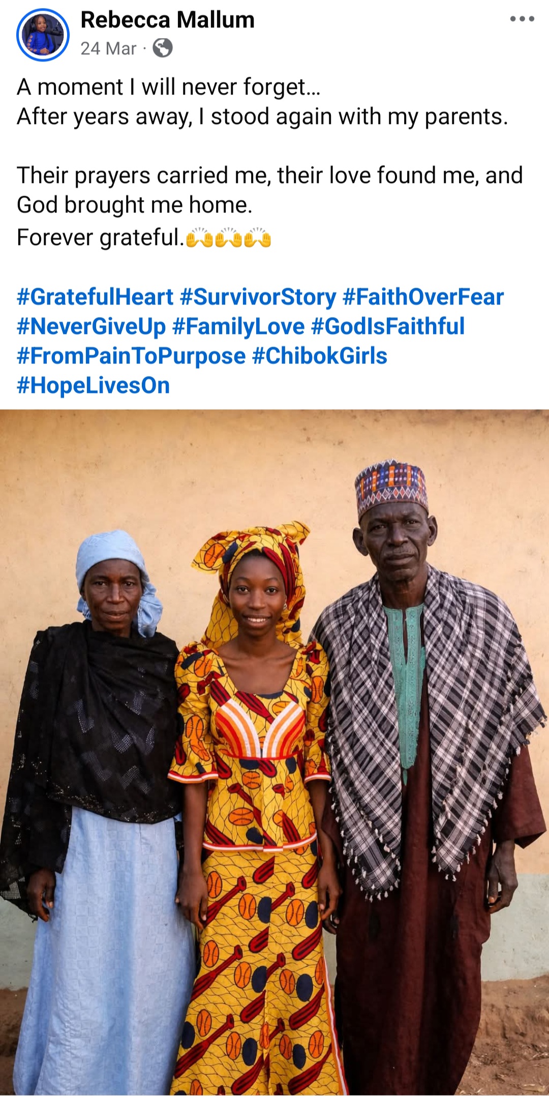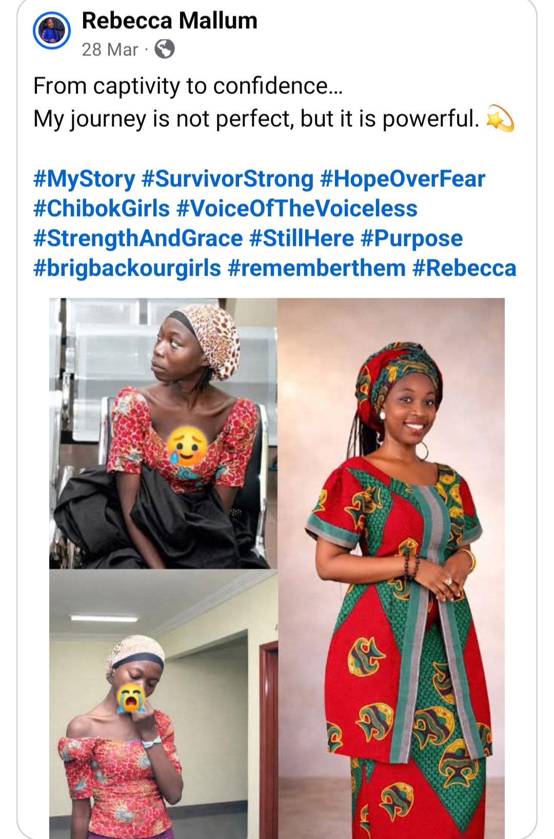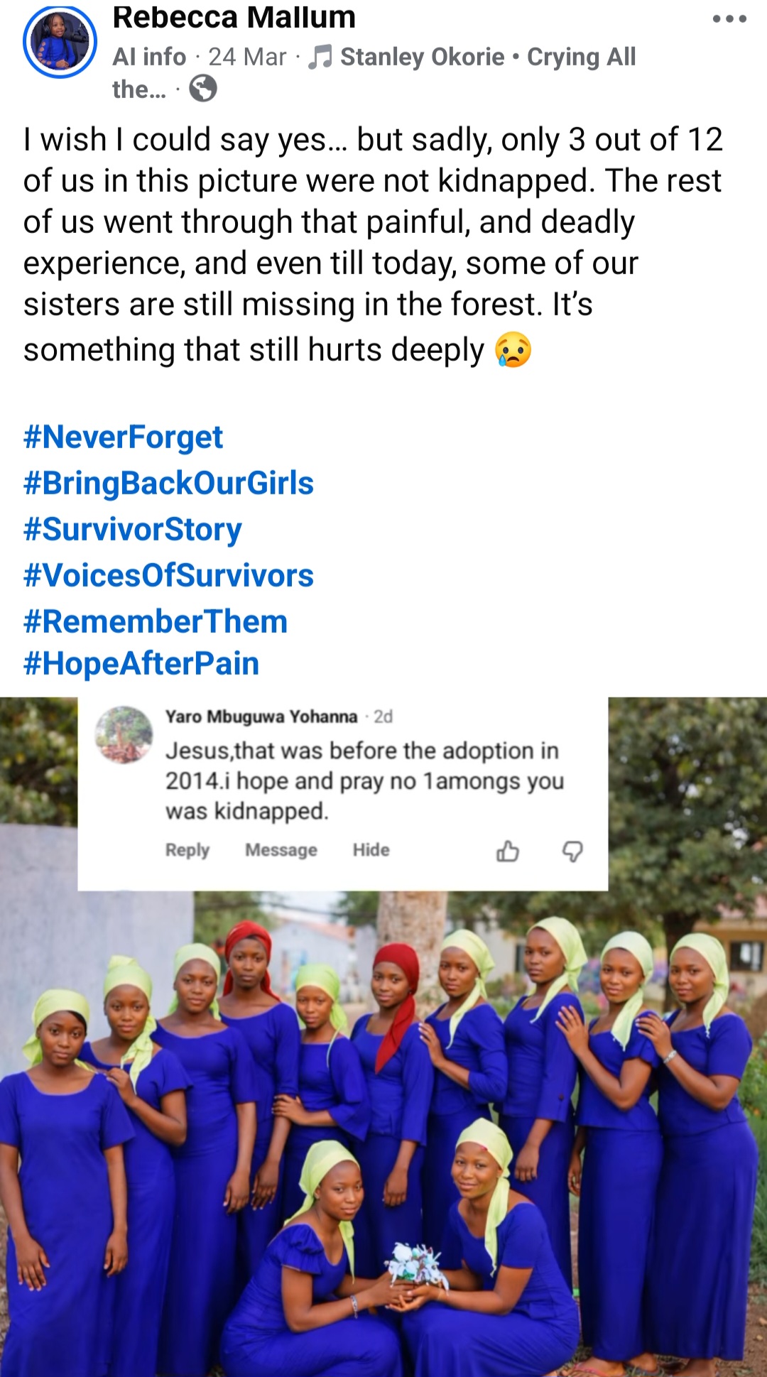 Rebecca ended her post with gratitude for those who have continued to remember, pray and stand with the girls over the years, and with a plea that the world never stop doing so. She said she speaks not just for herself but for the sisters whose voices are still silent, and for those who never made it home at all.
