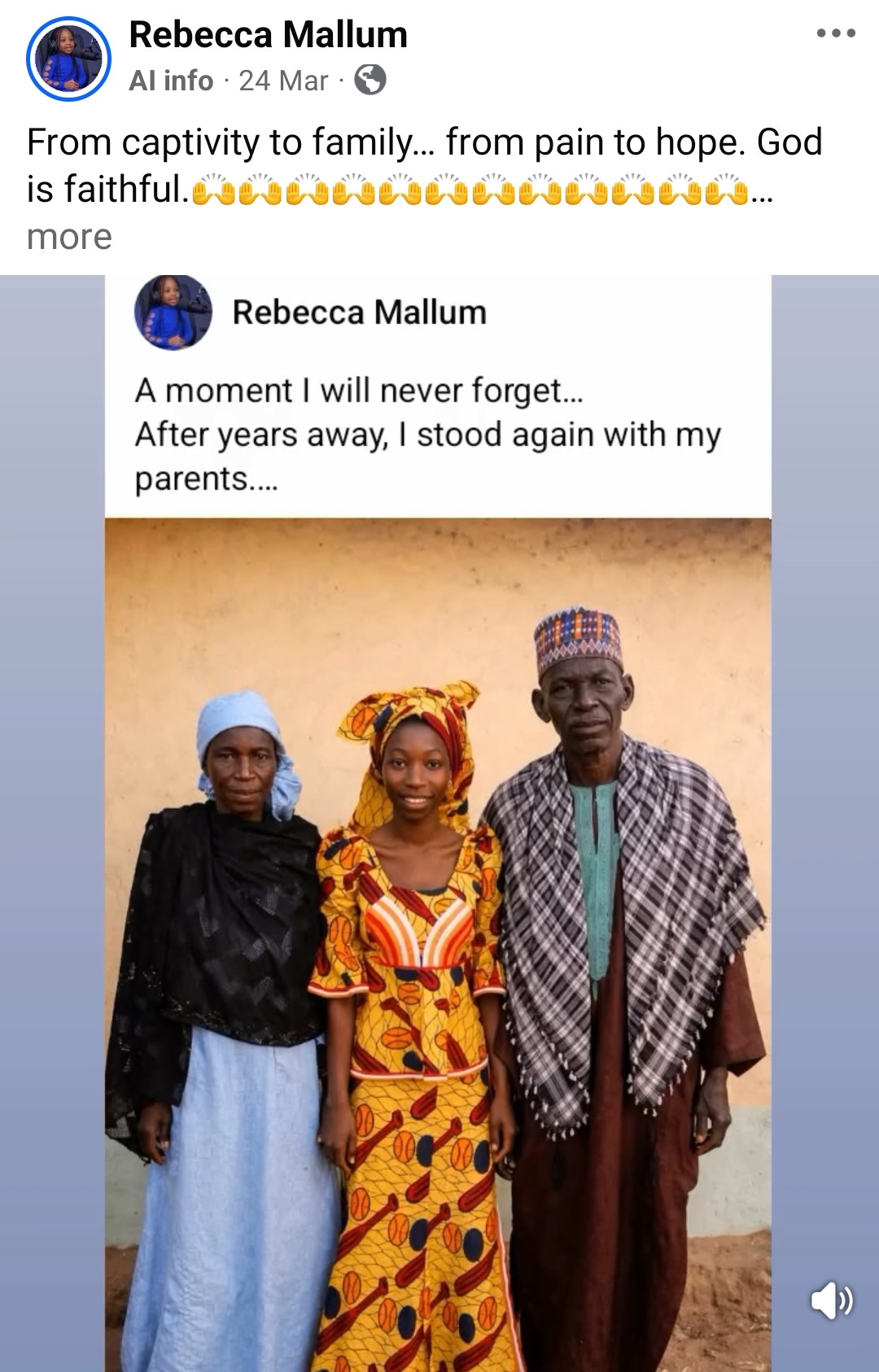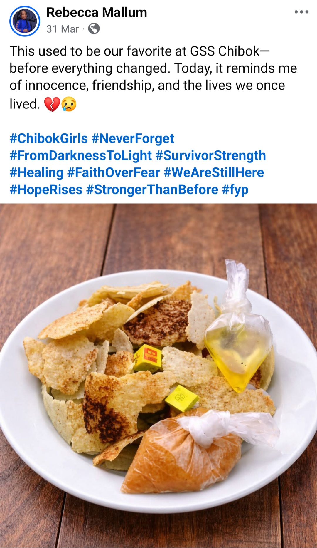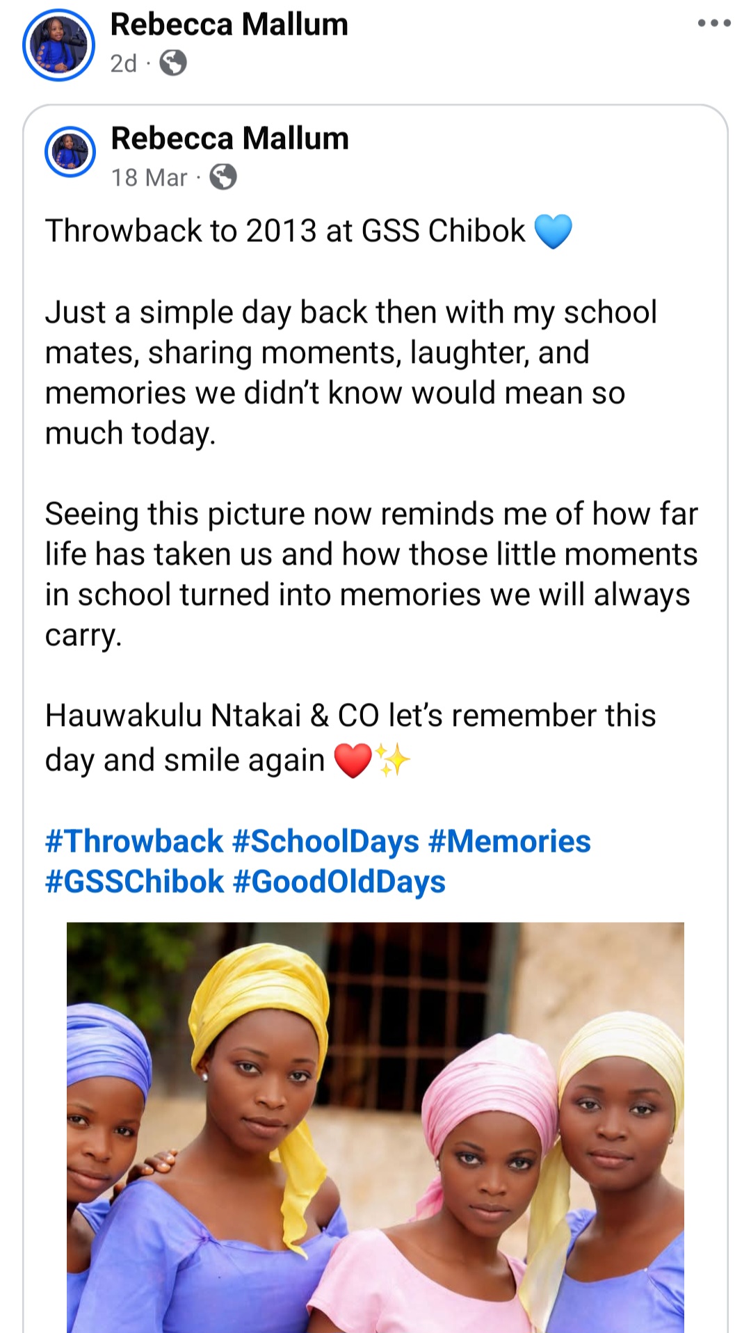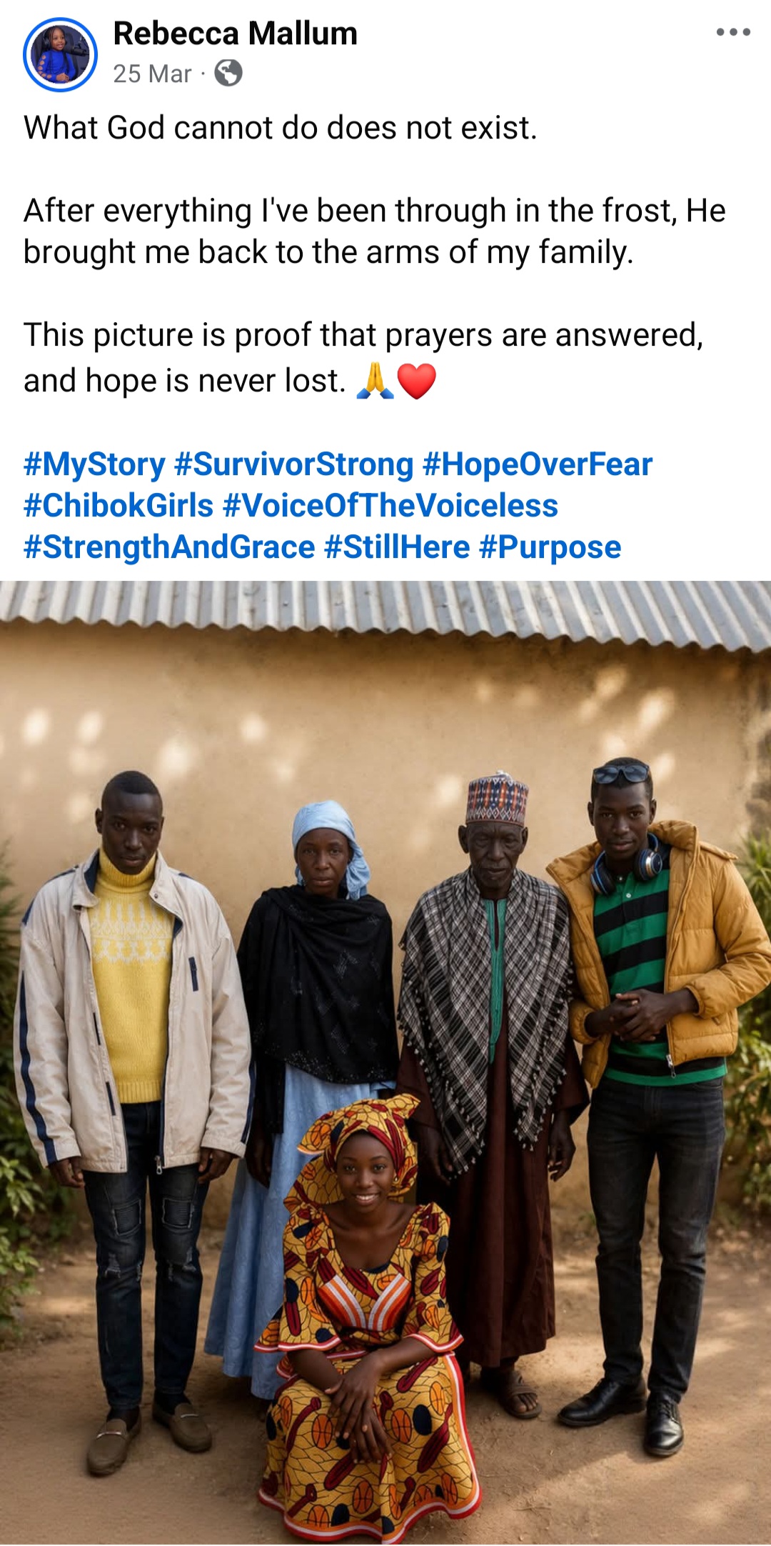Rebecca ended her post with gratitude for those who have continued to remember, pray and stand with the girls over the years, and with a plea that the world never stop doing so. She said she speaks not just for herself but for the sisters whose voices are still silent, and for those who never made it home at all.