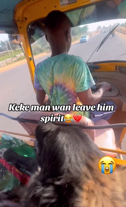 The passenger’s unruly dog frightened the keke driver, who remained glued to the driving wheel in a video that the passenger @larrylargekennel posted.
