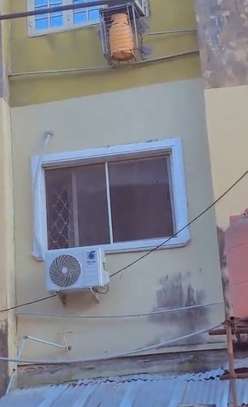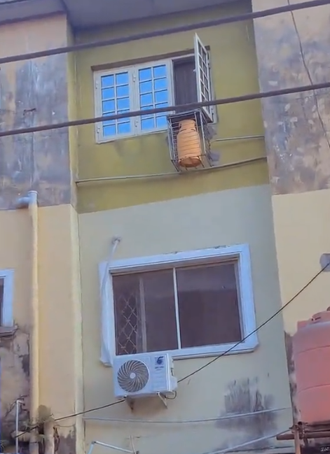 Instead of being kept in a traditional kitchen corner or a designated outdoor area, the gas cylinder was seen secured inside an iron cage attached to the building, positioned right beside a window. Interestingly, no visible balcony or platform was supporting the setup.