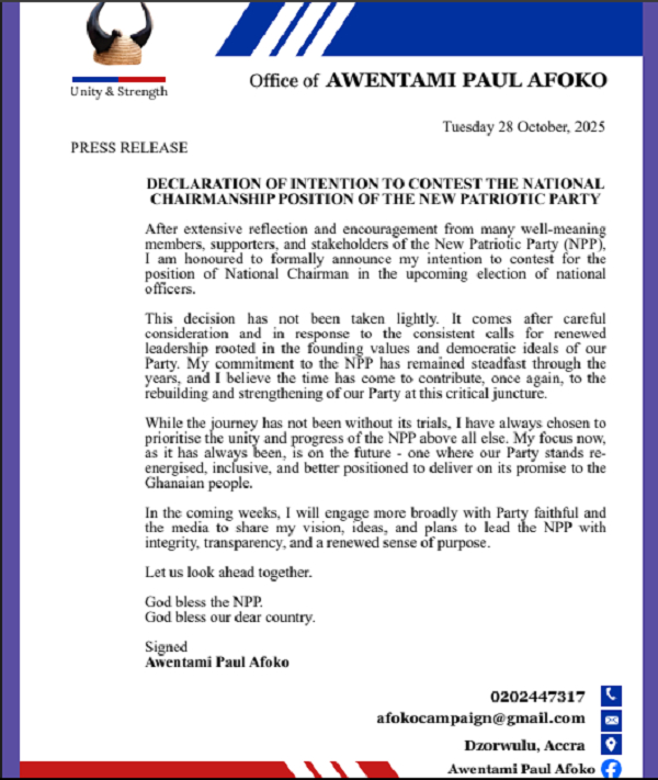 In an official statement signed by him and dated Tuesday, October 28, 2025, Afoko indicated that his decision to contest followed careful reflection and consideration of the party’s need for a change in leadership that upholds its values and ideologies, as well as his deep commitment to the party.