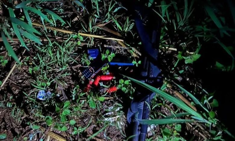 A pump action gun loaded with four live cartridges, two spent cartridges, and three assorted keypad mobile phones were retrieved from the scene.