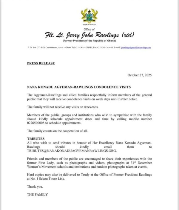 In a statement issued from the office of former President Jerry John Rawlings, the family said visits should be scheduled in advance by calling 0276500008 to arrange a date and time. No visits will be accepted on weekends.