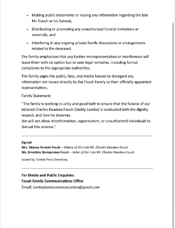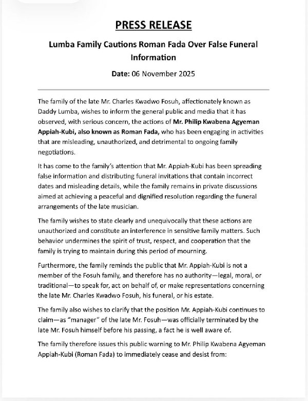 “The family, therefore, issues this public warning to Mr Philip Kwabena Agyeman Appiah-Kubi (Roman Fada) to immediately cease and desist from making public statements or issuing any information regarding the late Mr Fosu or his funeral, distributing or promoting any unauthorised funeral invitations or materials, and interfering in any ongoing private family discussions or arrangements related to the deceased,” the statement added.