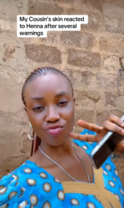 A lady reveals the aftermath of her cousin’s stubborn attitude after applying Henna to her skin despite a previous reaction a year ago.