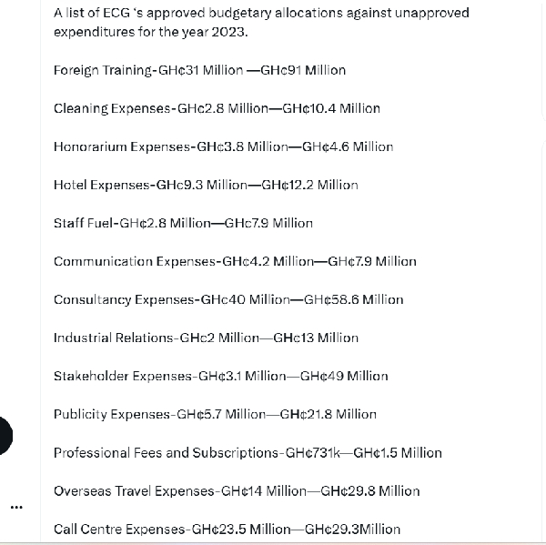 A list of ECG ‘s approved budgetary allocations against unapproved expenditures for the year 2023.