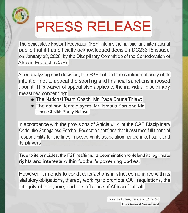 “The Federation of Senegalese Football (FSF) informs the national and international public that it has officially acknowledged decision DC23315 issued on January 28, 2026, by the Disciplinary Committee of the Confederation of African Football (CAF). After analyzing said decision, the FSF notified the continental body of its intention not to appeal the sporting and financial sanctions imposed upon it. This waiver of appeal also applies to the individual disciplinary measures concerning: the National Team Coach, Pape Bouna Thiaw; and the national team players, Ismaïla Sarr and Iliman Cheikh Baroy Ndiaye.