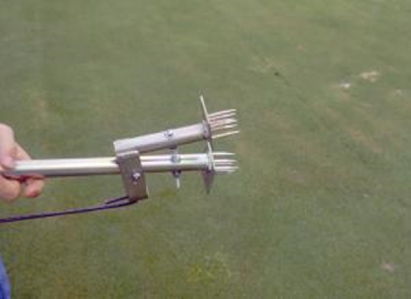 Also known as a divot tool or pitchfork, this is used to repair ball marks, depressions on the green caused by a ball landing. The tool loosens compacted turf around the mark, allowing grass to regrow quickly, and the surface is then smoothed with a putter.