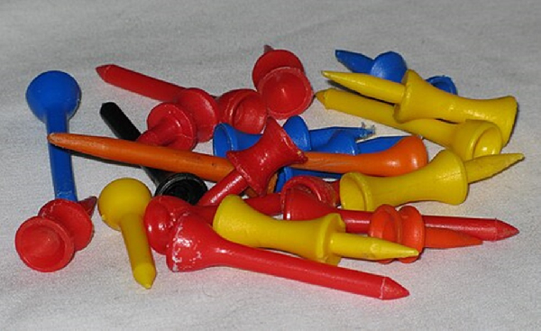 A tee is a small object, usually made of wood or plastic, pushed into the ground to hold a ball for the first stroke of each hole. Conventional tees are spikes with a small cup on top to hold the ball. Wooden tees are inexpensive but often break during play.
