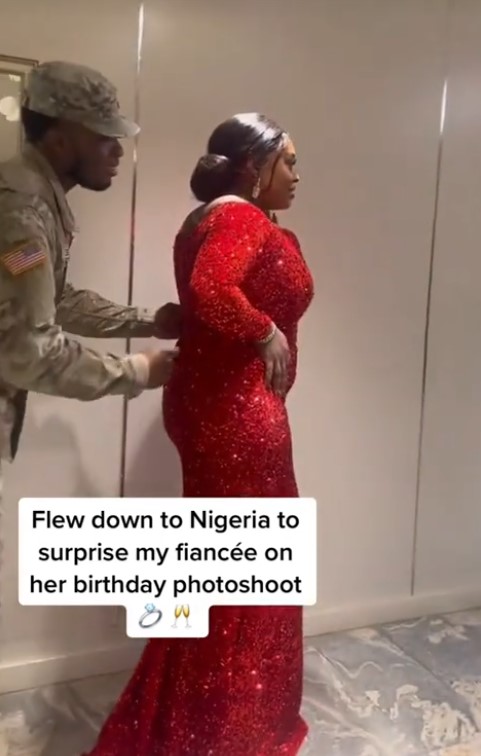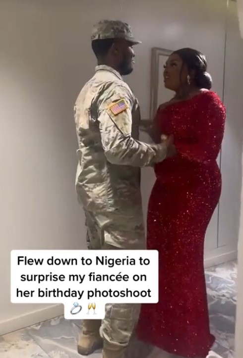 In a touching gesture, a Nigerian man serving in the US Army flew back to Nigeria to surprise his fiancée during her birthday photoshoot.