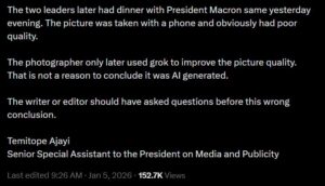 He explained that the Image was real, and was taken during a meeting in Paris between President Tinubu and the Rwandan president. H further explained that the AI tool was only used to enhance the quality of the image.